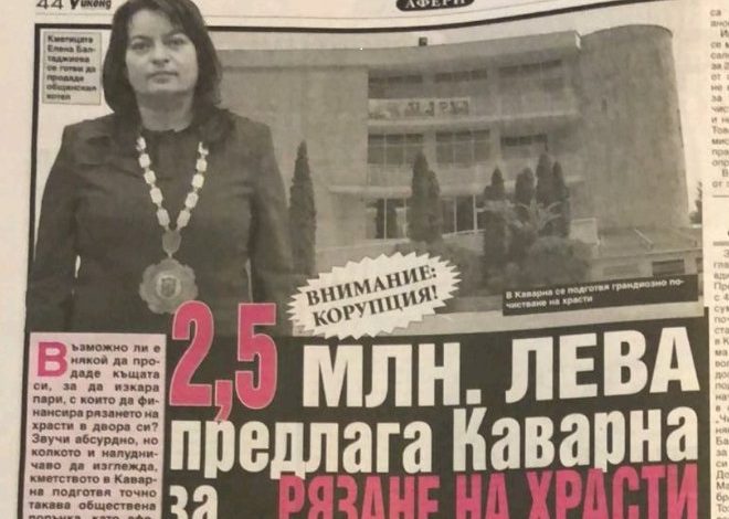 Скандалната кметица на Каварна от ВМРО, Елена Балтаджиева, организатор на корупционна схема, решила да продава общински хотел до морето, а сумата от проданта да инвестира в подрязване на храсти, информира ни вестник Уикенд. След като избирателите на община Каварна се отърваха от старата кметица, Нина Ставрева, която стана клиент на Прокуратурата заради множество схеми и измами, сега на дневен ред са корупционните схеми на новата, гладната Елена Балтаджиева от ВМРО.